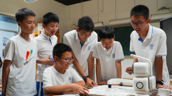 同样排起长队的还有VR太空舱体验活动,高度还原的神舟飞船返回舱在操场上格外引人注目。学生们进入舱门,佩戴VR眼镜,在虚拟现实技术的带领下瞬间便进入太空,开启了奇妙的“太空遨游之旅”。在科技节上,还有人与机器的“脑力”交锋,学生和下棋机器人开展象棋博弈,在落子间感受AI和机器人技术强大的计算和决策能力。初一年级三班的张晨嫣在体验后表示,“通过参加这次科技节,我感受到科技的奇妙,这也激励我们要更加努力学习,用科技去创新我们的生活。”