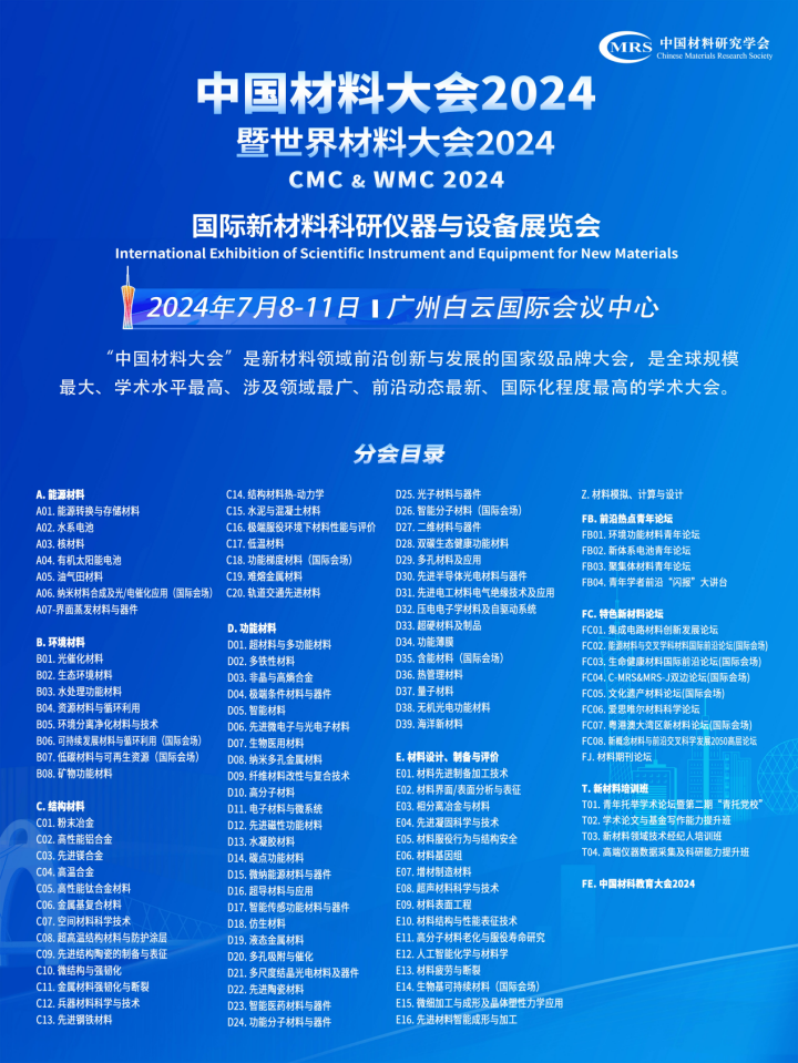 新材料产业是战略性、基础型产业,是未来高新技术产业发展的基石和先导。为大力推动新材料科技创新,加快提升产业链现代化水平。中国材料研究学会将于7月8-11日在广东省广州市白云国际会议中心举办“中国材料大会2024暨第二届世界材料大会”。