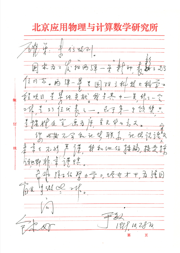 【家书背景】于敏的家信。信中提到:“两弹一星”是集体的贡献,我是其中一员,做了一定的工作,是23位代表之一。