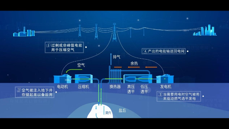 储能时,利用过剩或非峰值电能驱动电动机旋转,将电能转化为机械能,电动机带动压缩机(一种将低压气体提升为高压气体的机械)将空气从低压状态压缩至高压状态,并将高压空气储存在储气装置(盐穴、人工硐室或储气罐)中,最终将电能转换成空气热能和压力能。