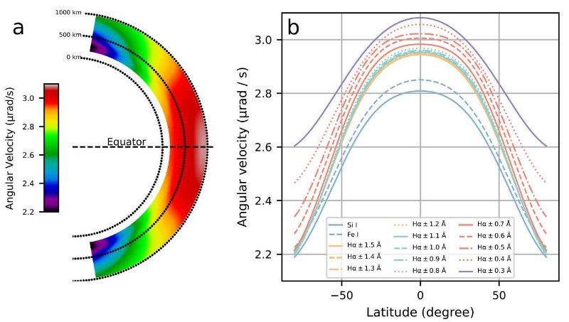 分析图像发现,太阳大气的自转速度随着高度有明显增加的趋势,这与直观认识相悖,因为如果高层大气的转动是由低层大气的粘滞效应带动的,那么自转速度应该随高度而逐渐降低。