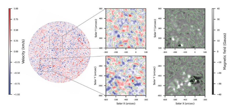 太阳色球多普勒速度场与视向磁场分布的对应关系,二者具有很好的相关性,验证了小尺度磁场与色球大气存在强冻结效应。 (图片来源:作者提供)