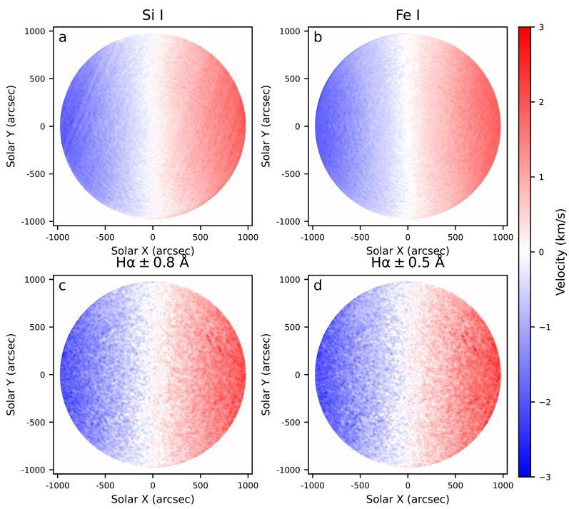 太阳大气由光球层底部到色球层不同高度处的多普勒速度图,太阳自转速度自赤道向极区逐渐降低的规律在太阳大气各个层次都存在。 (图片来源:作者提供)