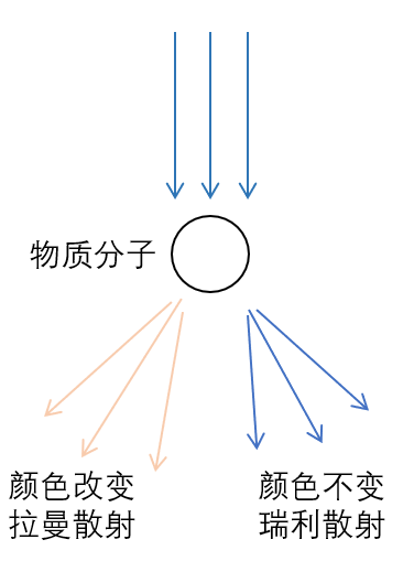 前边讲到,一种颜色的光,在与空气分子或是水分子等小分子碰撞时,会发生瑞利散射(颜色不变,方向改变),拉曼散射(颜色改变,方向也改变)。同种颜色的光在与不同物质分子产生拉曼散射现象时,颜色的改变程度是不一致的。