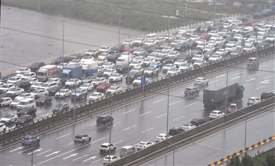 因前方道路积水,河南省郑州市东四环高架桥车辆行驶缓慢。 新华社记者 朱祥摄
