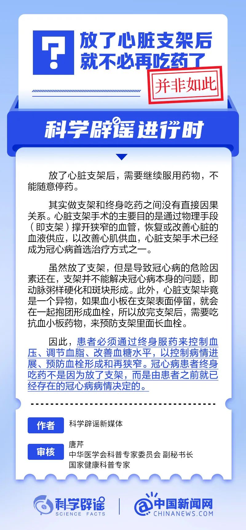 放了心脏支架后,需要继续服用药物,不能随意停药。其实做支架和终身吃药之间没有直接因果关系。虽然放了支架,但是导致冠心病的危险因素还在,支架并不能解决冠心病本身的问题,即动脉粥样硬化和斑块形成。此外,心脏支架毕竟是一个异物,如果血小板在支架表面停留,就会在一起抱团形成血栓,所以放完支架后,需要吃抗血小板药物,来预防支架里面长血栓。