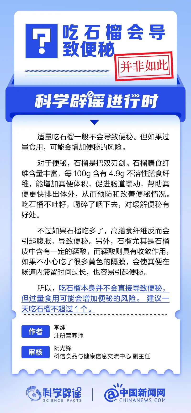 吃石榴会导致便秘吗?适量吃石榴一般不会导致便秘。但如果过量食用,可能会增加便秘的风险。石榴膳食纤维含量丰富,能增加粪便体积,促进肠道蠕动,帮助粪便更快排出体外。但如果石榴吃多了,高膳食纤维反而会引起腹胀,导致便秘。