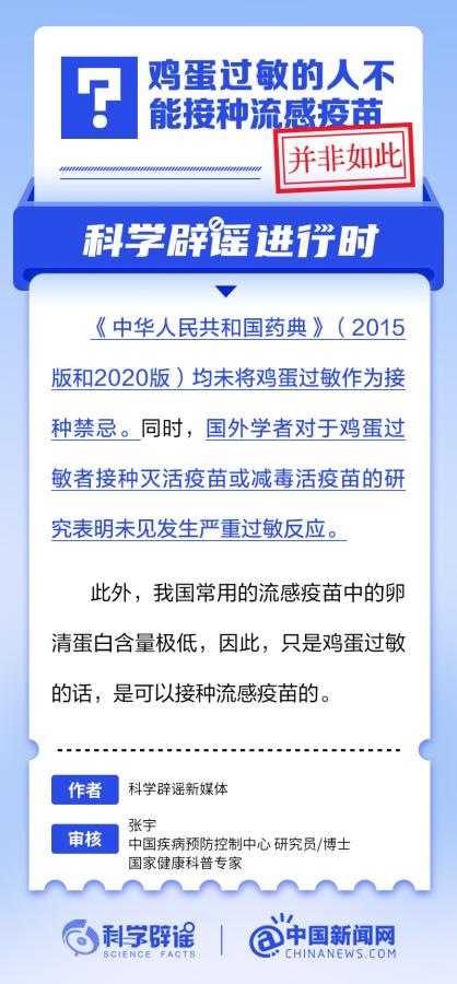《中华人民共和国药典》(2015版和2020版)均未将鸡蛋过敏作为接种禁忌。同时,国外学者对于鸡蛋过敏者接种灭活疫苗或减毒活疫苗的研究表明未见发生严重过敏反应。此外,我国常用的流感疫苗中的卵清蛋白含量极低,因此,只是鸡蛋过敏的话,是可以接种流感疫苗的。