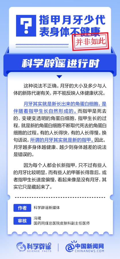 指甲月牙的大小及多少与人体的新陈代谢有关,并不能反映人体健康状况。月牙其实就是新长出来的角蛋白细胞,是伴随着指甲生长自然形成的。而指甲是死去的、变硬变透明的角蛋白细胞,指甲生长的过程,就是新的角蛋白细胞不断取代死去的角蛋白细胞的过程。有的人长得快,有的人长得慢。
