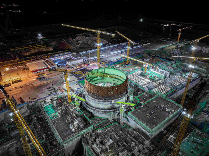 徐大堡核电厂二期工程夜景,塔吊高耸,脚手架林立,建筑工地一派繁忙景象