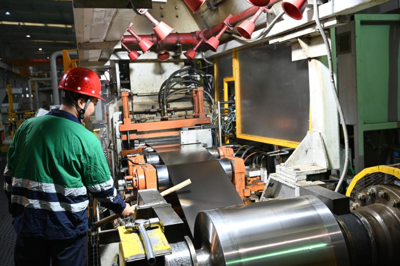10月18日,在金川集团镍合金有限公司,工作人员在镍带冷轧生产线上作业。新华社记者 范培珅 摄