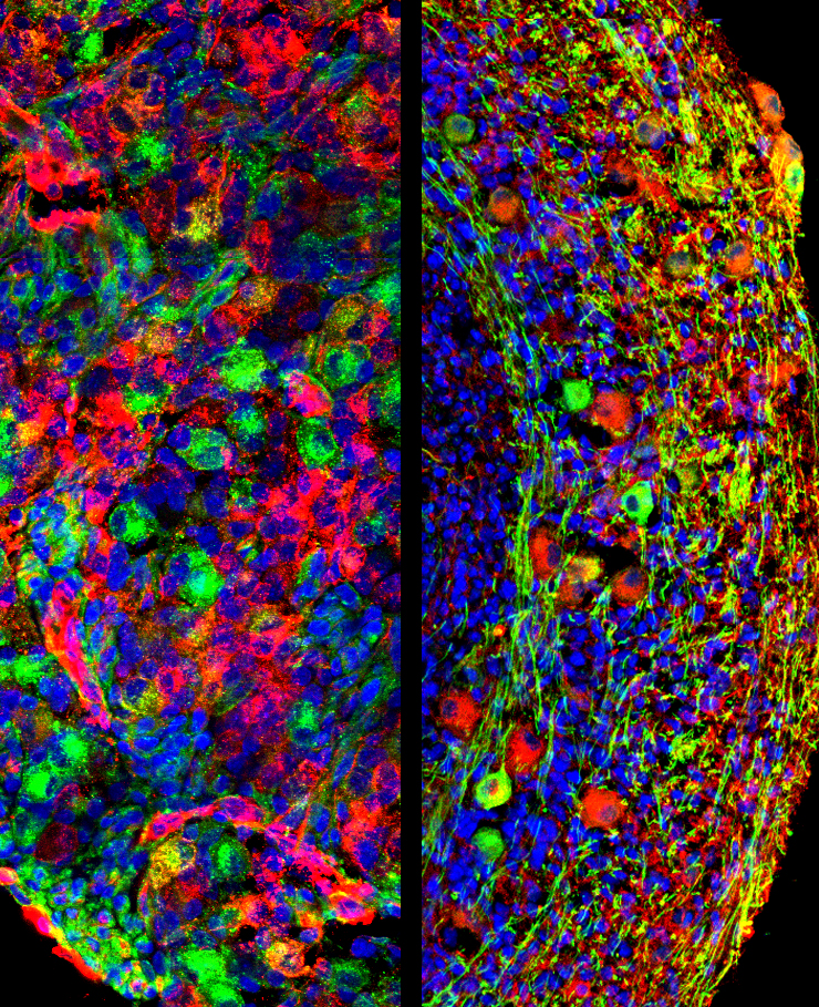 图为人类背根结节(左)和人类背根结节类器官(右)的细胞组成对比图。(受访者供图)