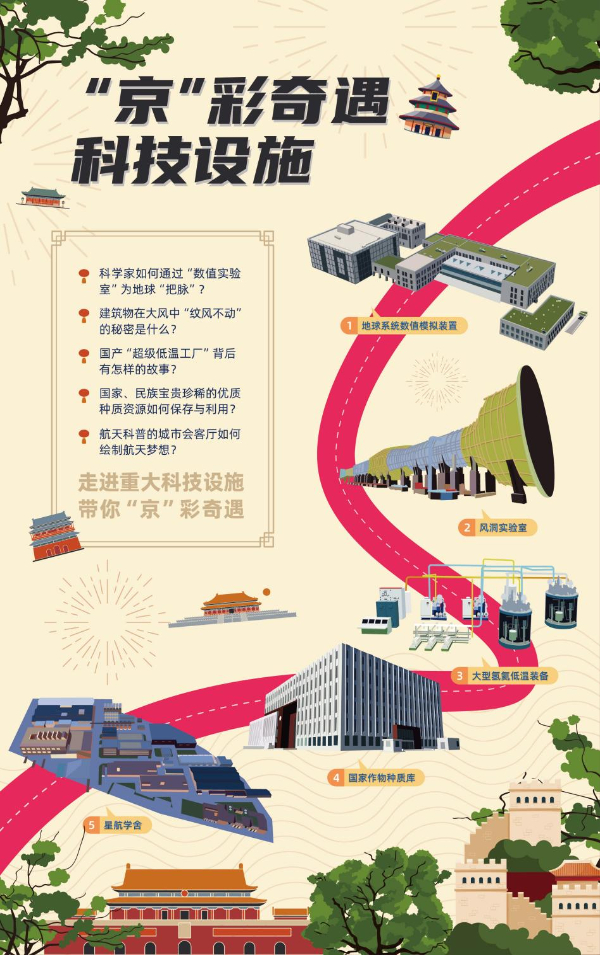 本期推出“‘京’彩奇遇科技设施”主题探索路线,带你走进北京市的地球系统数值模拟装置、风洞实验室、大型氢氦低温装备、国家作物种质库、星航学舍,领略尖端的科技魅力。