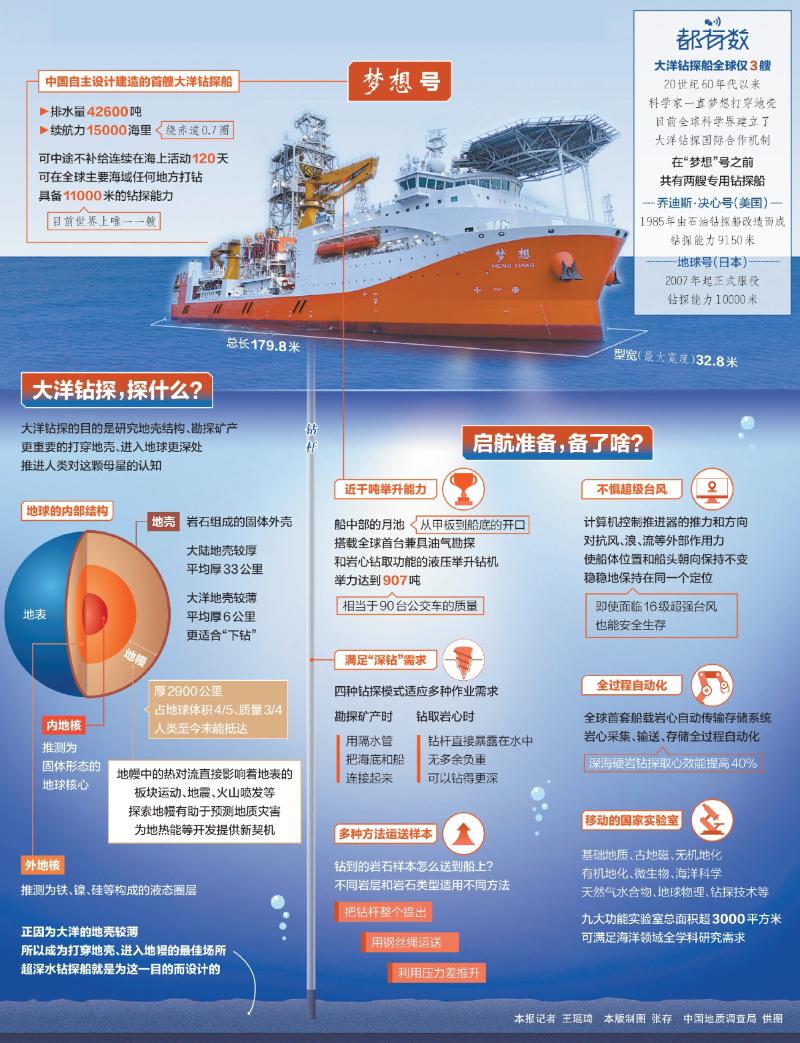 中国自主设计建造的首艘大洋钻探船“梦想”号11月17日在广州正式入列,这是目前世界上唯一一艘具备11000米超深水钻探能力的钻探船,它的目标是实现人类历史上首次“打穿地壳、进入地球深部”。为了达成这项目标,“梦想”号做了哪些准备?