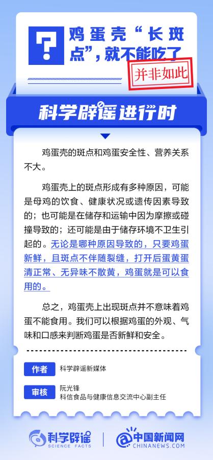 鸡蛋壳上的斑点形成有多种原因,可能是母鸡的饮食、健康状况或遗传因素导致的,也可能是在储存和运输中因为摩擦或碰撞导致的,还可能是由于储存环境不卫生引起的。无论是哪种原因导致的,只要鸡蛋新鲜,且斑点不伴随裂缝,打开后蛋黄蛋清正常、无异味不散黄,鸡蛋就是可以食用的。