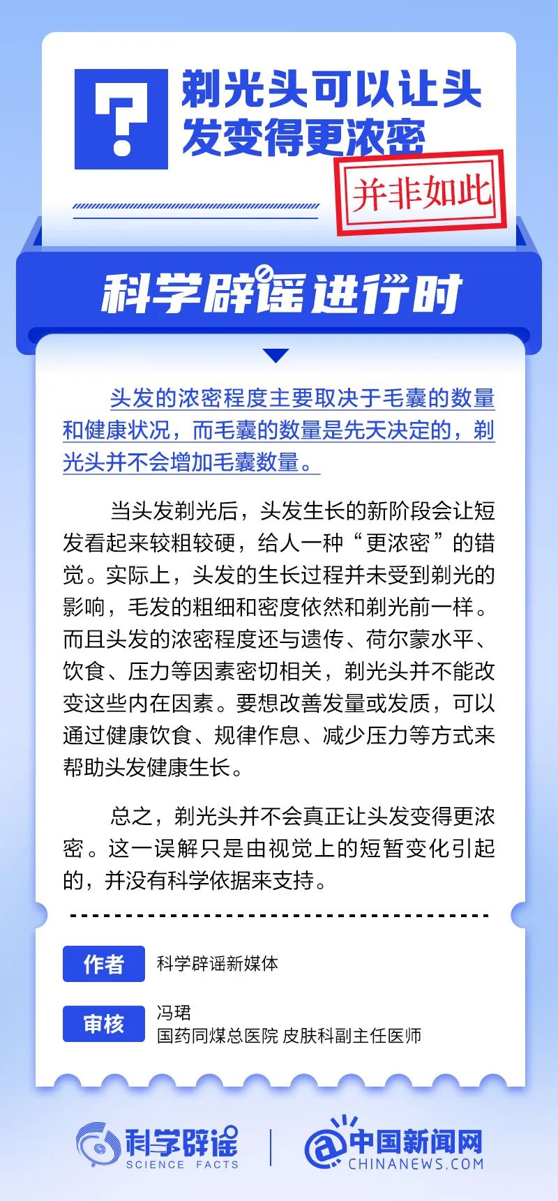 头发的浓密程度主要取决于毛囊的数量和健康状况,而毛囊的数量是先天决定的,剃光头并不会增加毛囊数量。当头发剃光后,头发生长的新阶段会让短发看起来较粗较硬,给人一种“更浓密”的错觉。实际上,头发的生长过程并未受到剃光的影响,毛发的粗细和密度依然和剃光前一样。
