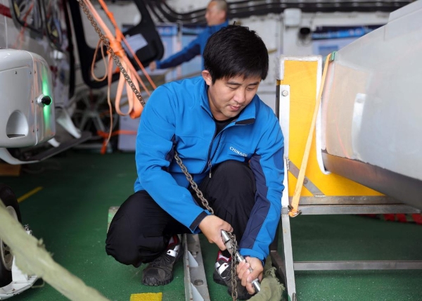 执行中国第41次南极考察任务的“雪龙”号和“雪龙2”号于北京时间2024年11月19日开始穿越“咆哮”西风带。这是“雪龙2”号直升机机组成员毕凌峰在拧紧直升机固定件。新华社记者黄韬铭摄