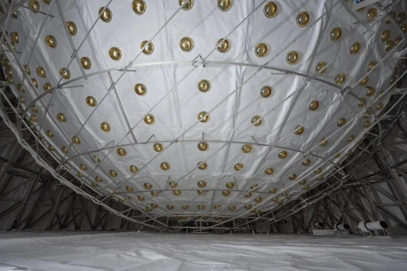 江门中微子实验位于广东江门开平市,它的核心探测设备(中心探测器)是一个有效质量2万吨的液体闪烁体探测器。布满中心探测器内壁的光电倍增管共同探测中微子被液体闪烁体“俘获”时产生的闪烁光,并将光信号转换为电信号输出。