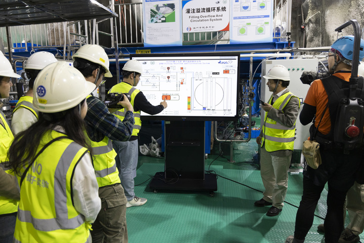 科研人员介绍,灌注完成后,中心探测器浸泡在水池中,水池可以同时作为水切伦科夫探测器和屏蔽体,屏蔽岩石的天然放射性及宇宙线在附近岩石中产生的大量次级粒子,去除影响中微子探测的干扰因素。