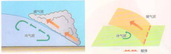 (2)暖锋雨:暖空气主动推进,缓慢爬升到冷空气上方,降雨强度小、时间长,范围广。