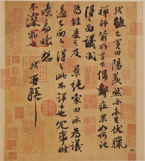 《阳羡帖》纸本,与来复的跋文装裱在一起,字里行间钤满印章。通过这些印章,我们得以了解到《阳羡帖》的流藏情况。自元代起,它已经进入收藏家的视野,郭畀、陆友都曾经是它的藏主;到了明代,它曾经沈周、崔深和项元汴收藏;清朝初年,收藏家元揆曾经收藏,后流入宫廷,著录于《石渠宝笈续编·乾清宫》第七册;后作为小白楼散佚书画于1963年转藏旅顺博物馆。