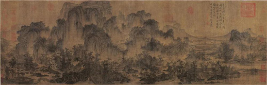 《茂林远岫图》中重墨法变化,用墨精致柔润,尤其是对淡墨的应用更是细腻持重、清逸传神。作品中的山峰以淡墨皴擦,确实有灵动朦胧之感,正如米芾《画史》中言“李成淡墨如雾中,石如云动”及王诜评“墨润而笔净,烟岚轻动”。画卷以左侧的主峰为重心,远景峦岭绵延起伏,近景水岸交错萦回,人物点景的比例被缩小,也与著录中“扫千里于咫尺,写万趣于指下”的李成画法相合。所以其画卷真正归属,仍有待更多的研究,也期待不远的将来,能亲眼见证辽宁省博物馆藏李成《小寒林图》与《茂林远岫图》并列的风采。
