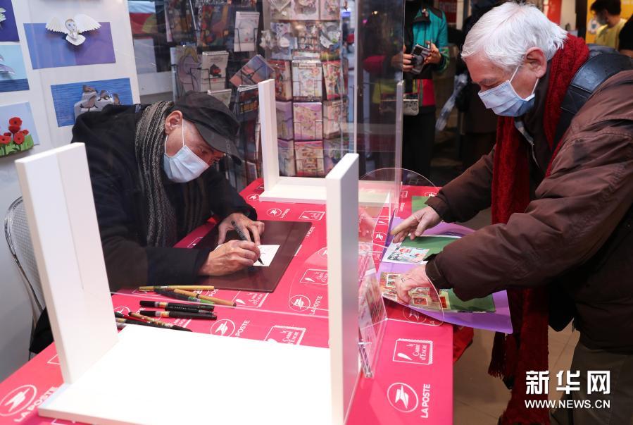 2月6日,在法国巴黎举行的牛年生肖邮票发行仪式上,邮票设计者陈江洪为集邮爱好者签售牛年生肖纪念邮票。新华社记者 高静 摄