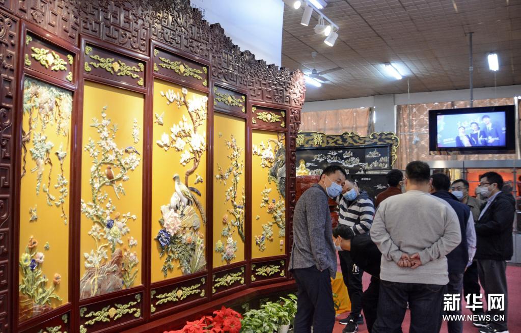 4月5日,观众在参观米春雷大师领衔制作的百宝镶嵌屏风《鸟语花香》。新华社记者李欣摄