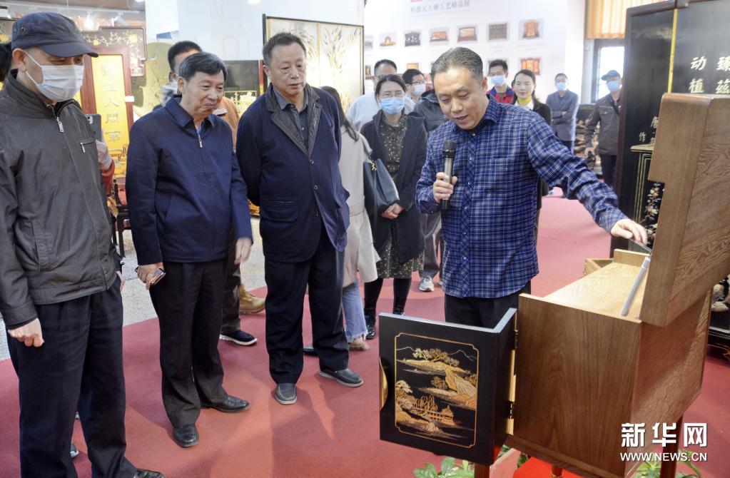 4月5日,国家级非物质文化遗产项目“金漆镶嵌髹饰技艺”代表传承人柏群(前右一)为观众介绍青年设计师的金漆镶嵌作品。新华社记者李欣摄
