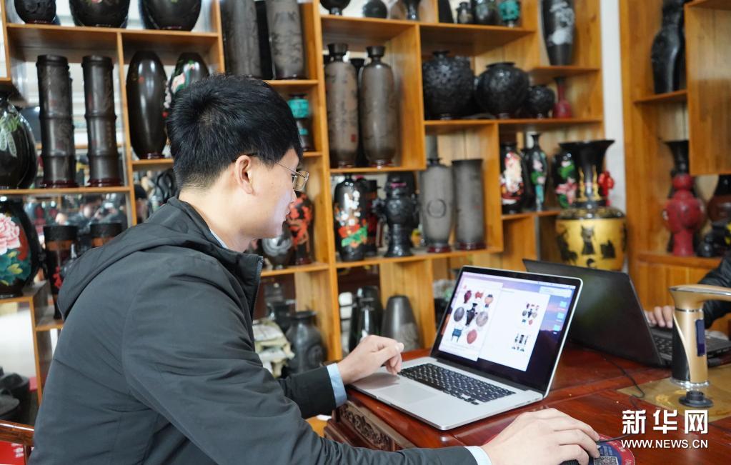 4月20日,在馆陶县一家黑陶生产企业,业务员与顾客进行线上沟通。新华社记者 金皓原 摄