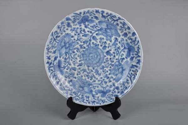 青花瓷不仅仅是国粹,也是古代文化的结晶。此次上拍的清康熙青花满花牡丹纹大盘,造型端庄,发色秀丽、线条流畅写意,整体绘画工艺都十分精美,盘芯内绘有一只大牡丹,盘内壁四株双犄牡丹,牡丹显得枝壮、叶茂、花繁, 牡丹代表富贵,也是吉祥的象征。牡丹文化是中华传统文化及民俗学的重要组成部分,牡丹纹饰的作品也倍受藏友喜爱。