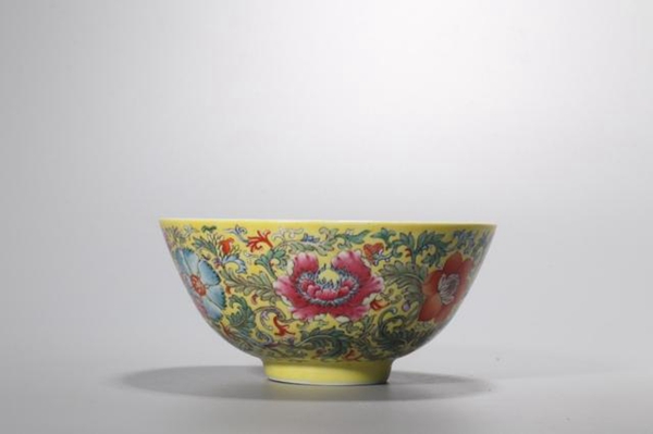 不止有淡雅的青花器物,华丽的粉彩精品也是藏家们眼中的“宠儿”。一只清光绪黄地粉彩花卉纹五福纹碗即将上拍。此碗敞口,深弧腹,圈足。内壁施白釉,外壁以粉彩绘黄地四季花纹饰。彩料颜色丰富,红、绿、黄、蓝等皆备,形成五色烂漫的装饰效果,是难得一见的精品。