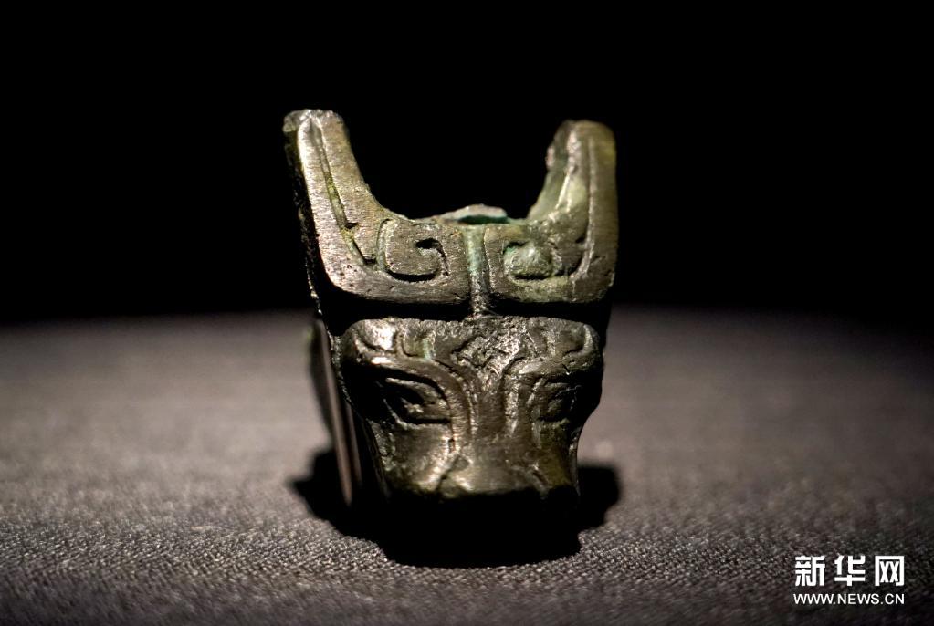 6月7日在奉贤博物馆展厅拍摄的四川成都金沙遗址博物馆藏文物“铜牛首”。