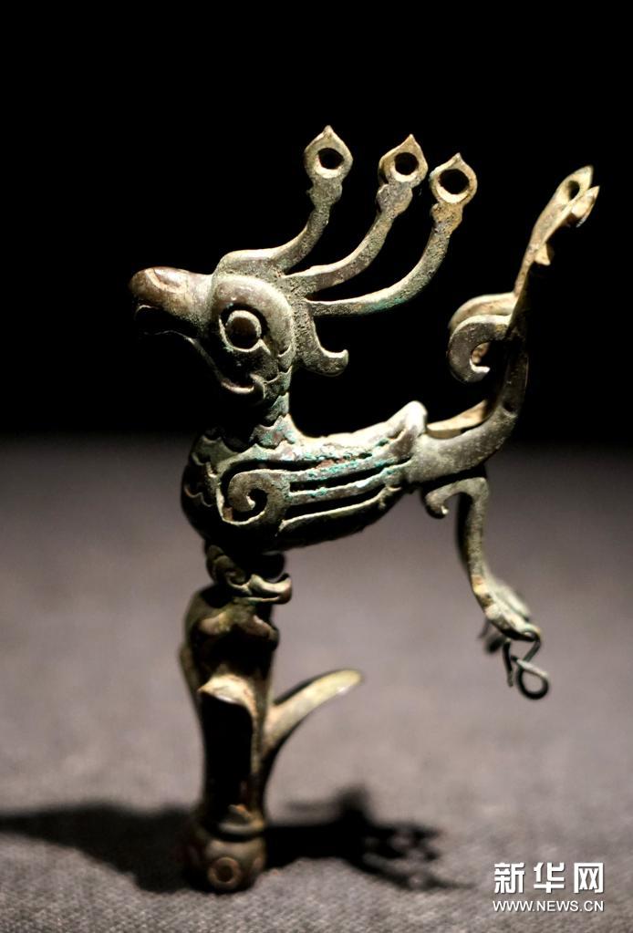 6月7日在奉贤博物馆展厅拍摄的四川广汉三星堆博物馆藏文物“铜神树枝头花蕾及立鸟”。新华社记者 任珑 摄