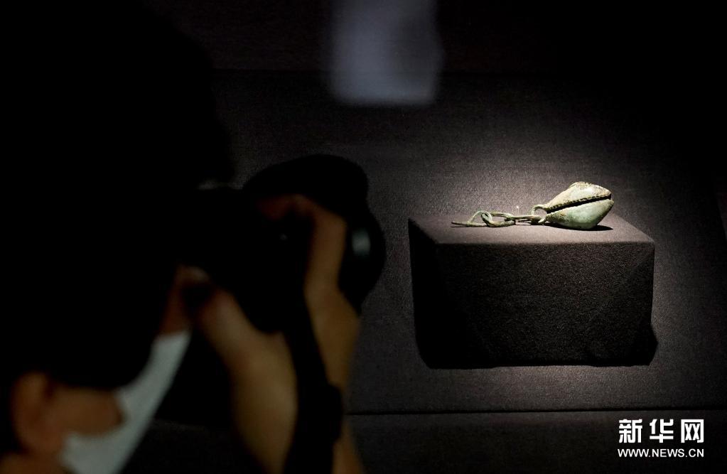 6月7日,一名媒体记者在上海奉贤博物馆展厅拍摄四川广汉三星堆博物馆藏文物“铜扇贝形挂饰”。新华社记者 任珑 摄