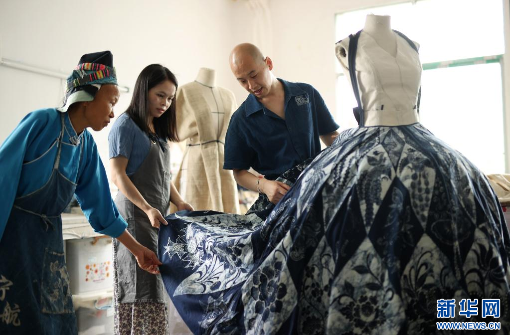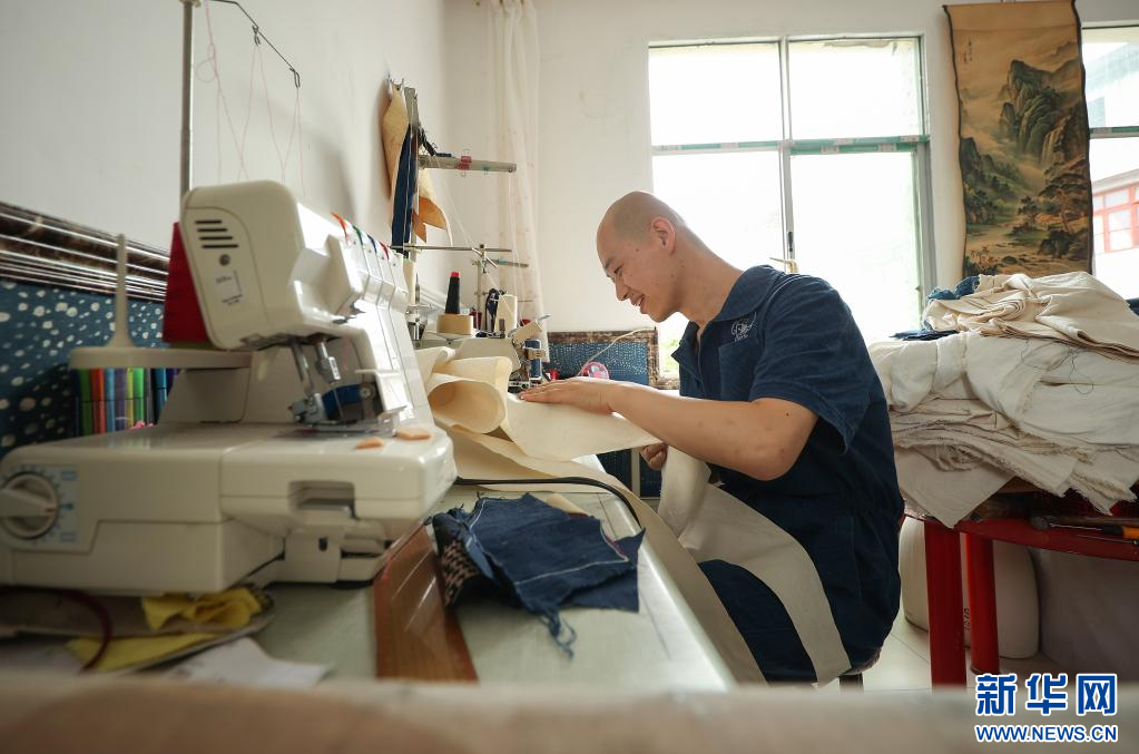 8月10日,在贵州省黔东南苗族侗族自治州丹寨县宁航蜡染工坊,成昊在缝制新设计的蜡染时装样版。新华社发(黄晓海 摄)