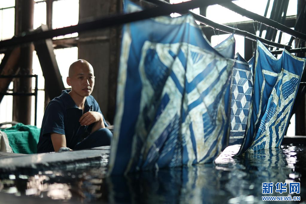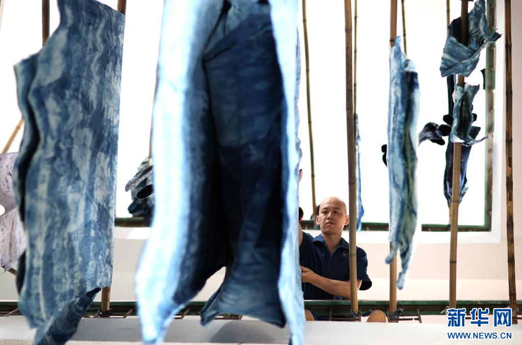 8月10日,在贵州省黔东南苗族侗族自治州丹寨县宁航蜡染工坊,成昊在查看蜡染时装面料的浸染效果。新华社发(黄晓海 摄)