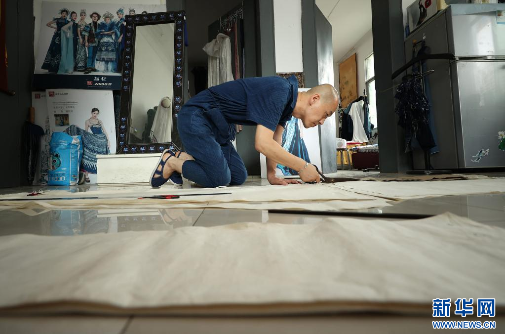 8月10日,在贵州省黔东南苗族侗族自治州丹寨县宁航蜡染工坊,成昊在裁剪新设计的蜡染时装样版。 新华社发(黄晓海 摄)