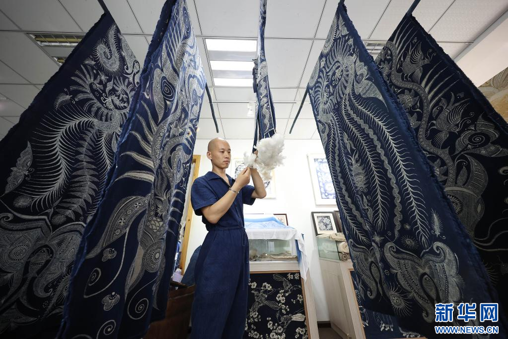 8月10日,在贵州省黔东南苗族侗族自治州丹寨县宁航蜡染工坊,成昊在晾晒浸染好的蜡染时装。 新华社发(黄晓海 摄)