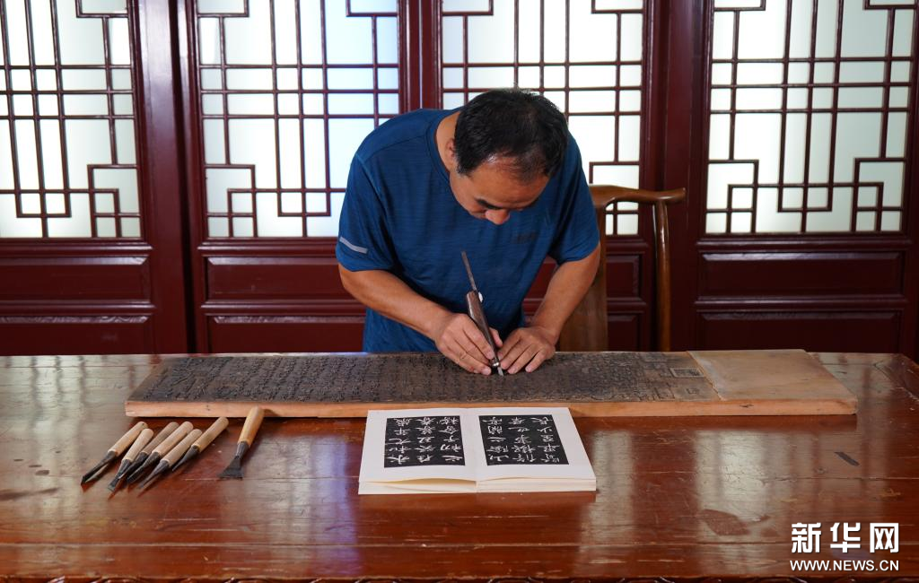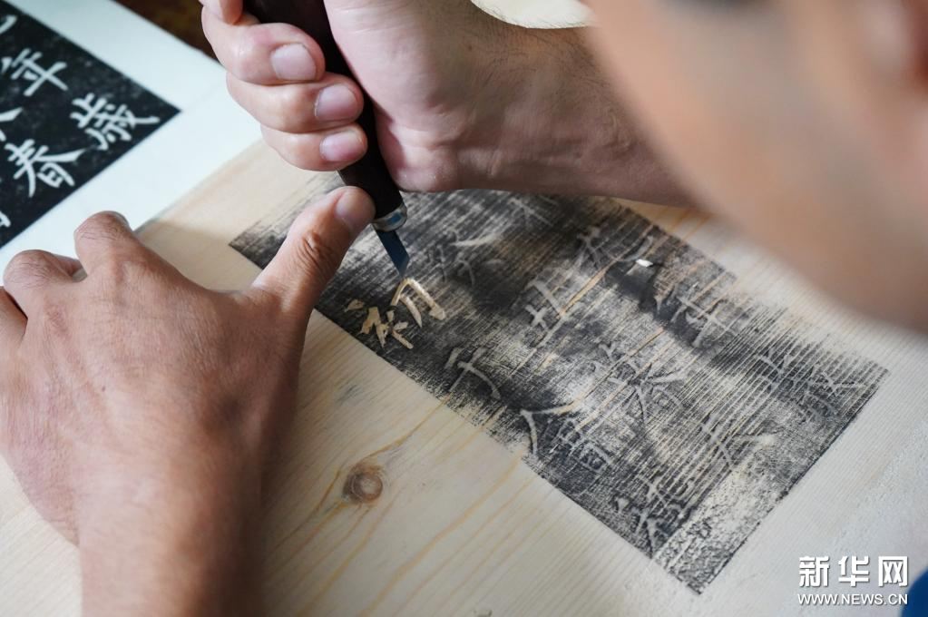 9月1日,衡水法帖雕版拓印技艺的代表性传承人李广民在雕刻法帖雕版拓印作品《兰亭集序》。河北衡水法帖雕版拓印技艺兴起于明朝,盛行于清朝,历史悠久。法帖雕版拓印是将名家的书法镌刻在木板或石板上,其工序包括选材加工、雕版、拓印、装帧等步骤,其精湛的雕刻技艺充分展现出汉字书法的精妙。2011年,衡水法帖雕版拓印技艺被列入第三批国家级非物质文化遗产名录。新华社记者 金皓原 摄