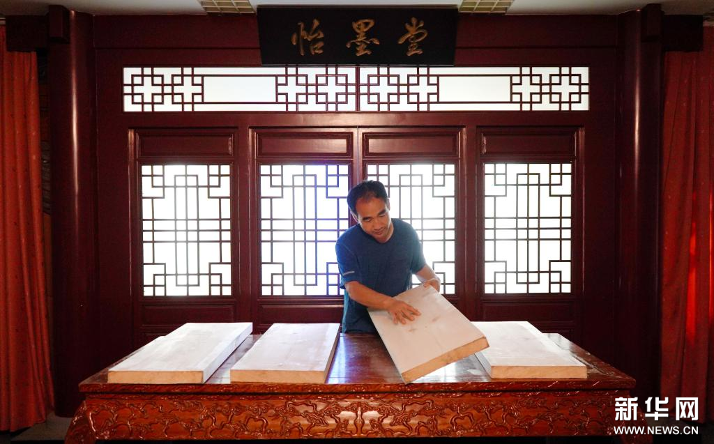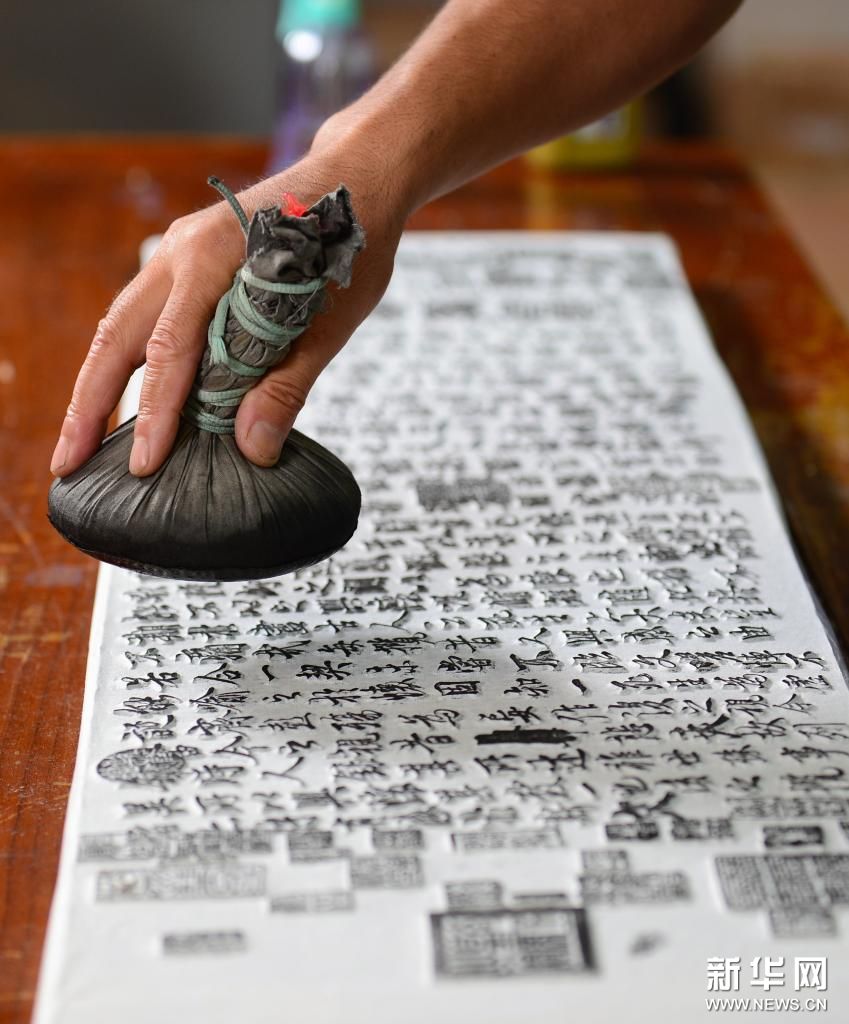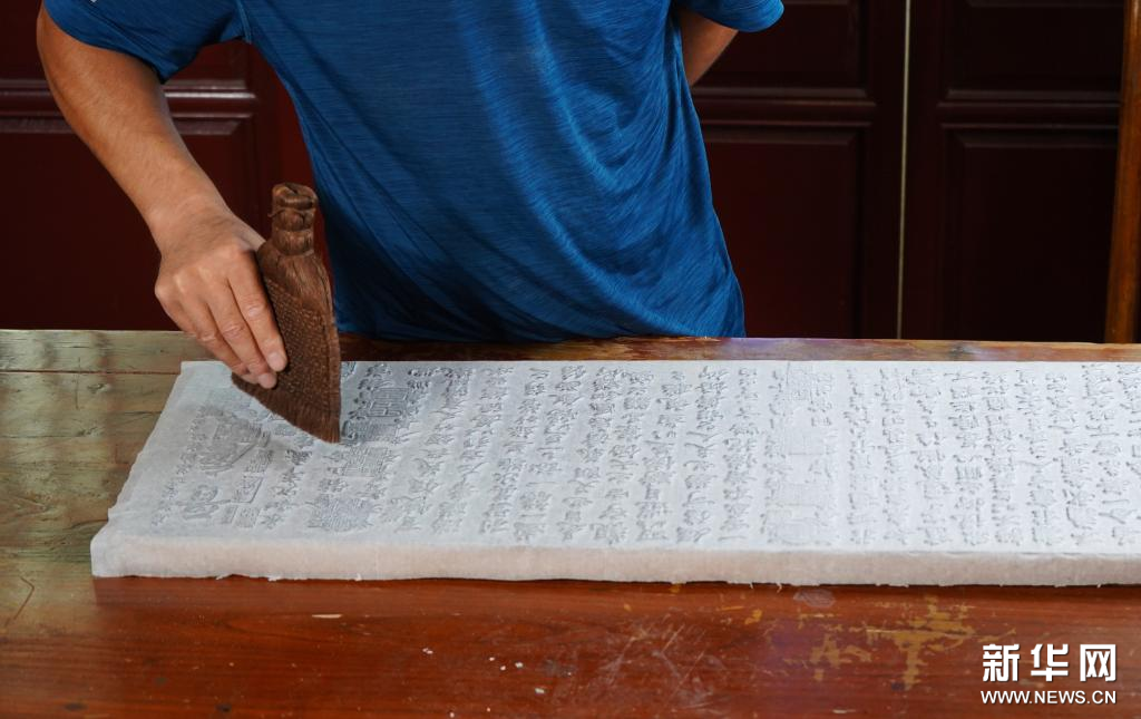 9月1日,衡水法帖雕版拓印技艺的代表性传承人李广民在拓印前用刷子找平。新华社记者 金皓原 摄