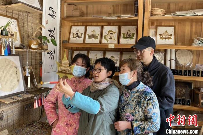 龙玉玉在她的叶雕艺术馆教授叶雕技艺。 受访者供图