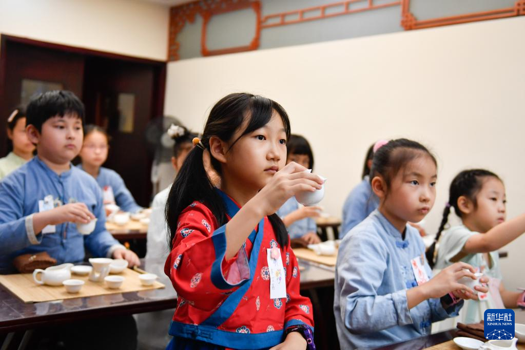 2021年10月3日,小朋友在杭州青少年发展中心“Do都城”举办的“传华夏文化 通古今未来”主题活动中参加“南宋小茶人”体验项目。 当日是国庆假期第三天,各地的人们通过丰富多彩的形式享受假期欢乐时光。 新华社记者 黄宗治 摄