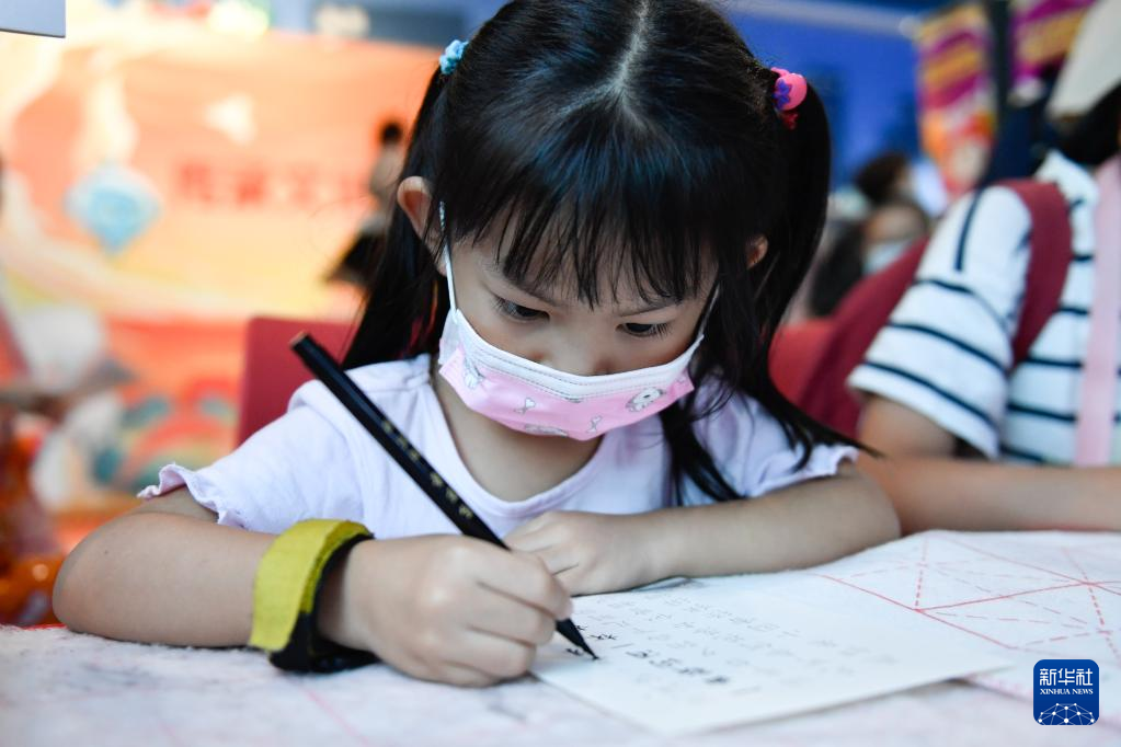 10月3日,小朋友在杭州青少年发展中心“Do都城”举办的“传华夏文化 通古今未来”主题活动中参加“书法家”体验项目。新华社记者 黄宗治 摄