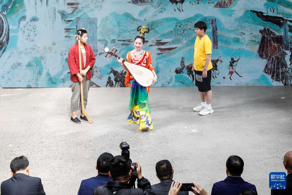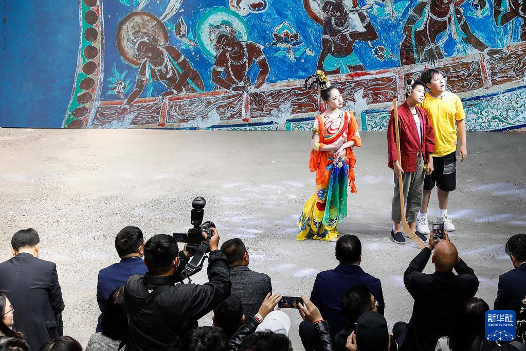 10月19日,演员们在发布会上表演敦煌文化主题的儿童舞台剧。 新华社记者 张玉薇 摄