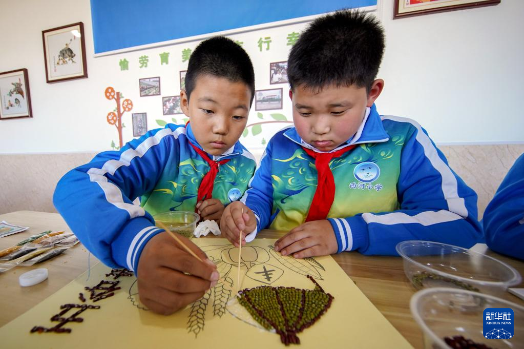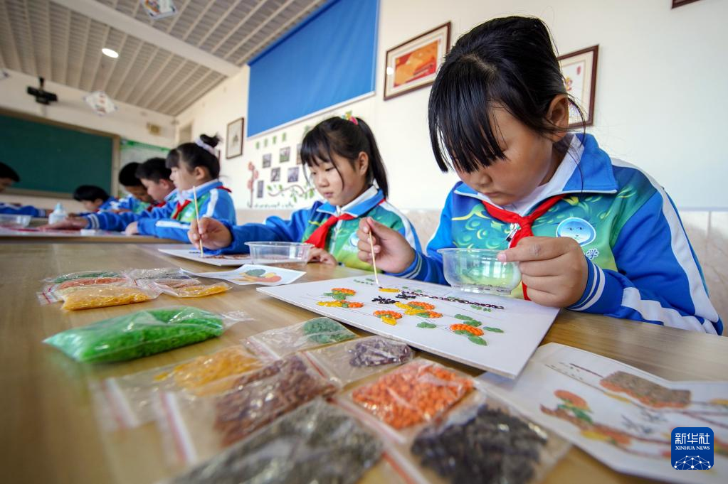 10月20日,河北省唐山市丰南区西河小学学生在制作五谷画。近年来,河北省唐山市丰南区将五谷画引入学校课堂,设为校本课程,丰富学生校园生活。新华社记者 骆学峰 摄