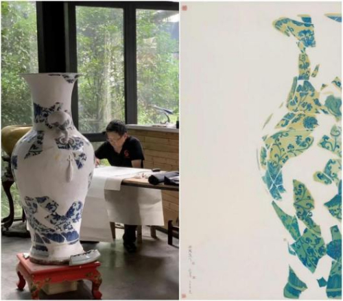 宿利群创作的《雍正青花缠枝西番莲象耳大瓶》在展出作品中尤为显眼醒目,吸引众多目光。宿利群介绍,该作品的创作源自景德镇一个瓶子的造型。据说此瓶产于雍正年间,但在烧造的过程当中,可能未达到最终要求,被官方销毁。多年后,罗国新把这件东西收藏下来,用石膏把它复制成完整的一个器物。宿利群利用它的破碎程度和整体之间的关系,把修补瓷瓶的石膏和有意识的留白结合在一起,从而形成了作品所绘物体你中有我,我中有你的关系,强调了它的形式感。