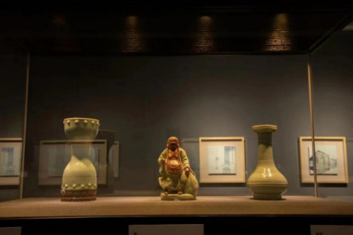 宿利群喜欢收藏瓷器、画瓷器,在本次的展出中特别展出了他的20余件瓷器收藏。藏品中瓷器的用途种类可谓十分丰富,有盘、壶、罐、人物造型等。其中产自北宋的《定窑模印莲华双鱼纹大盘》颜色典雅,图案清晰,可以称得上为定窑之瑰宝。同样不可错过的还有10件陶瓷枕,其造型丰富多样,令人大开眼界。