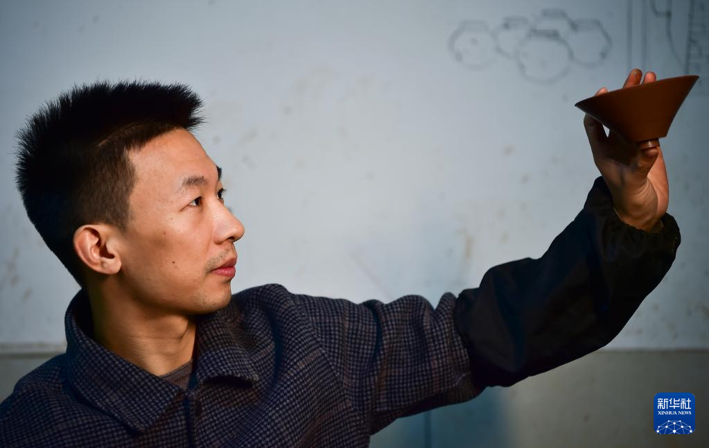 10月22日,吕继成在制作陶器过程中观察调整茶盏外形。