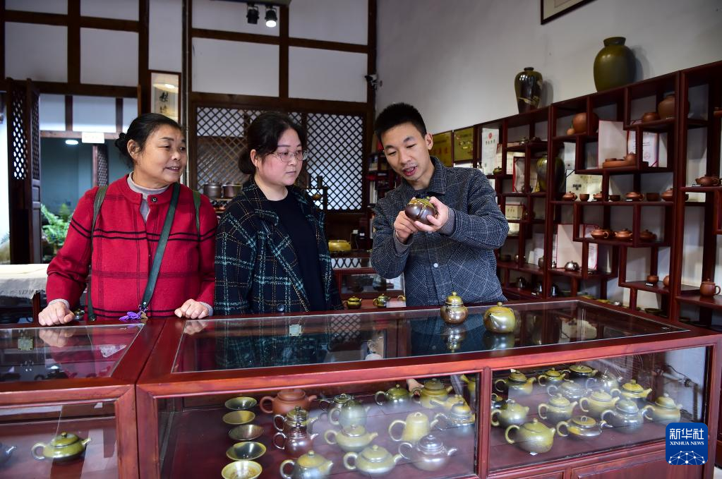 10月22日,吕继成(右一)在向前来工作室参观的游客介绍陶壶作品。 新华社记者王全超摄